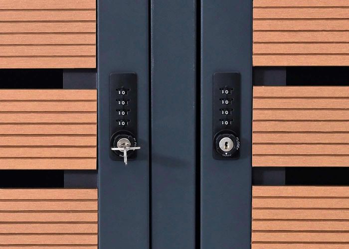 Die Mülltonnenbox ist für handelsübliche Mülltonnen mit einem Fassungsvermögen von 80 bis 240 Litern ausgelegt. Bitte messen Sie im Zweifelsfall Ihre Mülltonne vorher aus. Dieser Mülltonnenschrank ist ideal um gelbe Säcke und Ihre Mülltonne sicher vor Wind aufzubewahren. Die Türen und Deckel sind getrennt abschliessbar: sie verfügen über ein Zahlenschloss, das individuell mit einem 4-stelligen Sicherheitscode eingestellt werden kann.