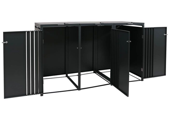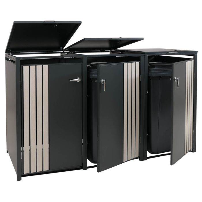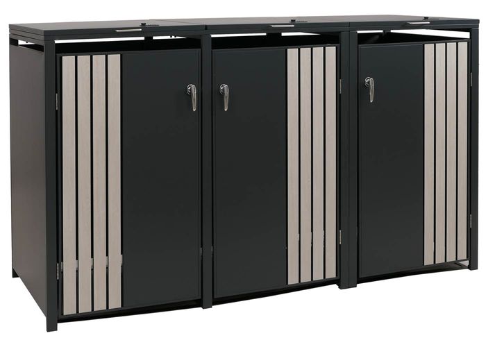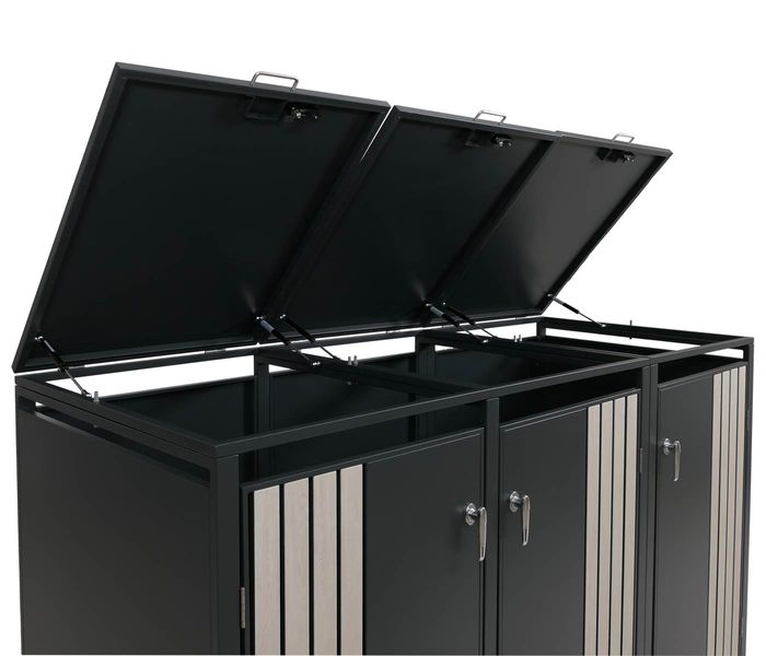 - Diese moderne Mülltonnenverkleidung ist nicht nur optisch ansprechend. Neben den abschliessbaren Türen und einem sehr stabilen Gehäuse, sind die Deckel dieser Mülltonnenverkleidung mit Gasdruckfedern ausgestattet.