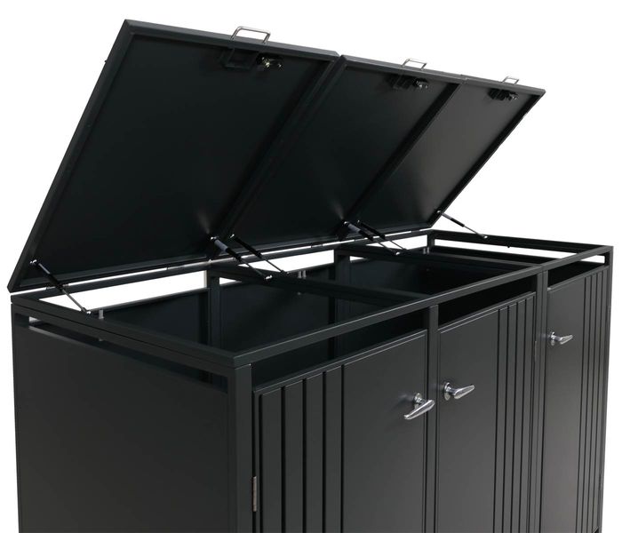 - Diese moderne Mülltonnenverkleidung ist nicht nur optisch ansprechend. Neben den abschliessbaren Türen und einem sehr stabilen Gehäuse, sind die Deckel dieser Mülltonnenverkleidung mit Gasdruckfedern ausgestattet.