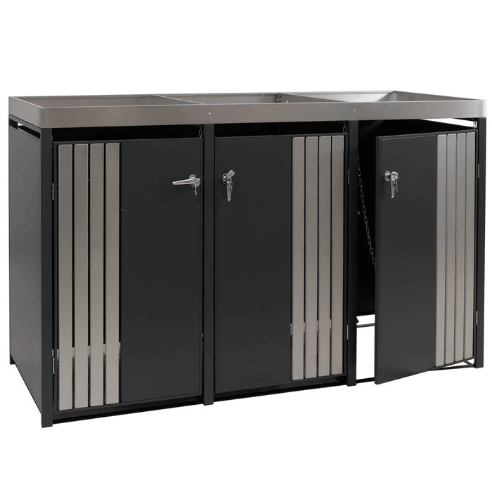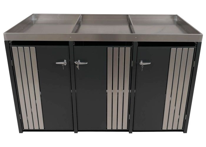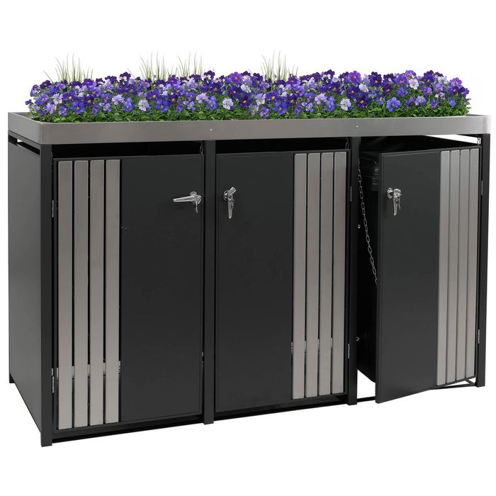 - Diese moderne Mülltonnenverkleidung ist nicht nur optisch ansprechend. Neben den abschliessbaren Türen und einem sehr stabilen Gehäuse ist diese Mülltonnenverkleidung mit einem Pflanzkasten ausgestattet.