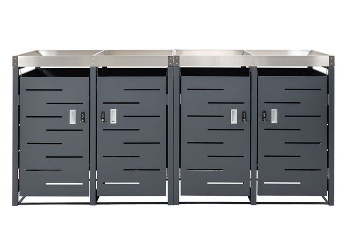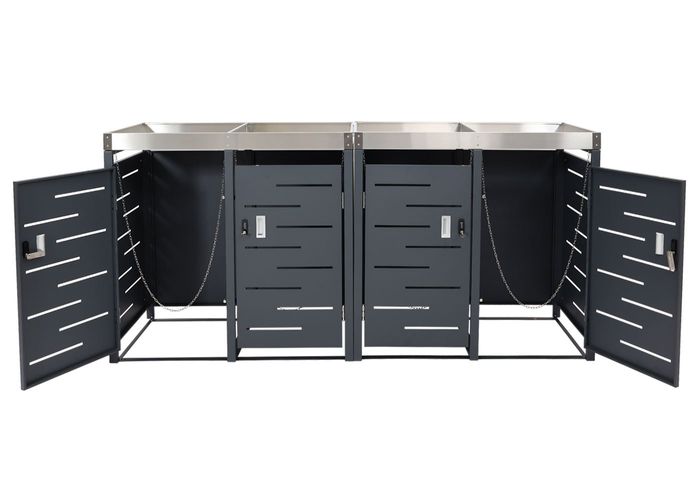 - Diese moderne Mülltonnenverkleidung mit Pflanzkasten ist nicht nur optisch ansprechend. Neben den abschliessbaren Türen lässt sich diese Mülltonnenabdeckung in anthrazit ganz einfach mit weiteren Modellen unserer Serie erweitern.