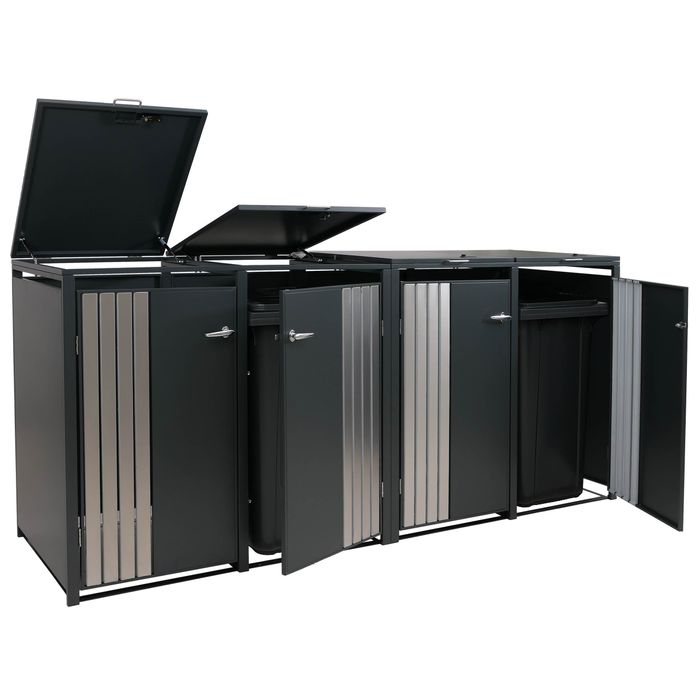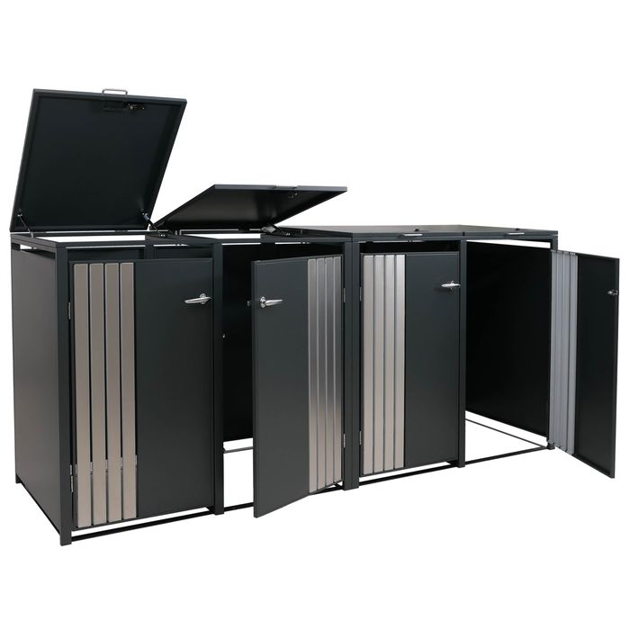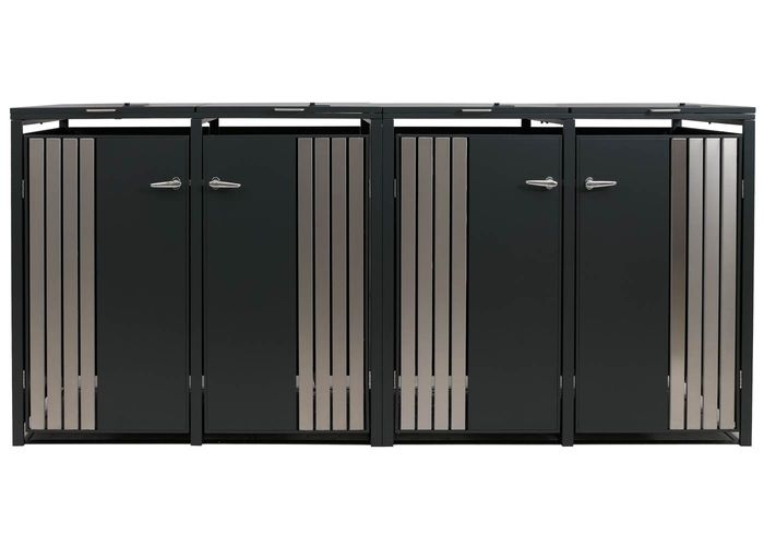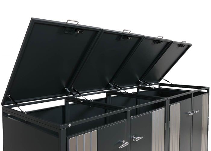 - Diese moderne Mülltonnenverkleidung ist nicht nur optisch ansprechend. Neben den abschliessbaren Türen und einem sehr stabilen Gehäuse, sind die Deckel dieser Mülltonnenverkleidung mit Gasdruckfedern ausgestattet.