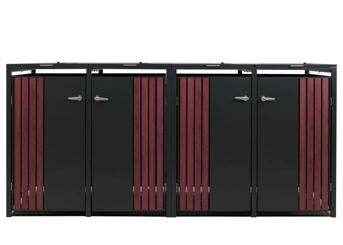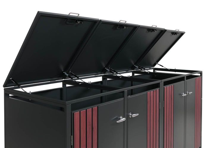 - Diese moderne Mülltonnenverkleidung ist nicht nur optisch ansprechend. Neben den abschliessbaren Türen und einem sehr stabilen Gehäuse, sind die Deckel dieser Mülltonnenverkleidung mit Gasdruckfedern ausgestattet.