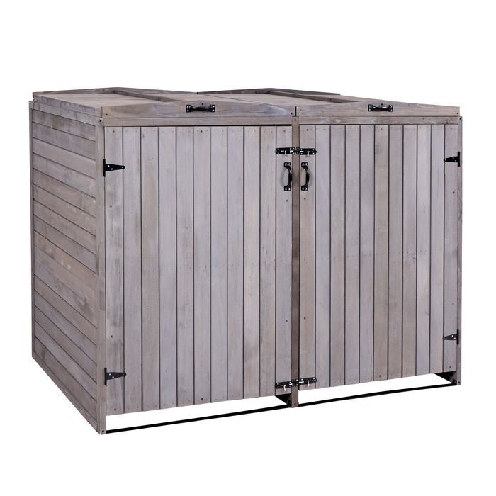 Zwischen den einzelnen Abteilen einer 2er-Mülltonnenverkleidung gibt es eine Trennung. Jedes Abteil ist für handelsübliche Mülltonnen mit einem Fassungsvermögen von 80 bis 240 Litern ausgelegt. Der Deckel ist mit einer Halterung ausgestattet, damit bleibt er offen stehen und erleichtert Ihnen das Befüllen der Mülltonnen. Beide Deckel sind ausserdem mit einer Wind-Sicherung durch Ketten ausgestattet. Durch die vier Griffe wird Ihnen das Öffnen und Schliessen der Deckel und Türen erleichtert. Beide Türen verfügen jeweils über zwei Riegelschlösser. Da die Rückwand verkleidet ist, kann der Mülltonnenschrank auch frei aufgestellt werden. Bei Holz handelt es sich um ein Naturprodukt. Wir empfehlen Ihnen dieses in regelmässigen Abständen neu zu behandeln, um es vor Witterungseinflüssen zu schützen.