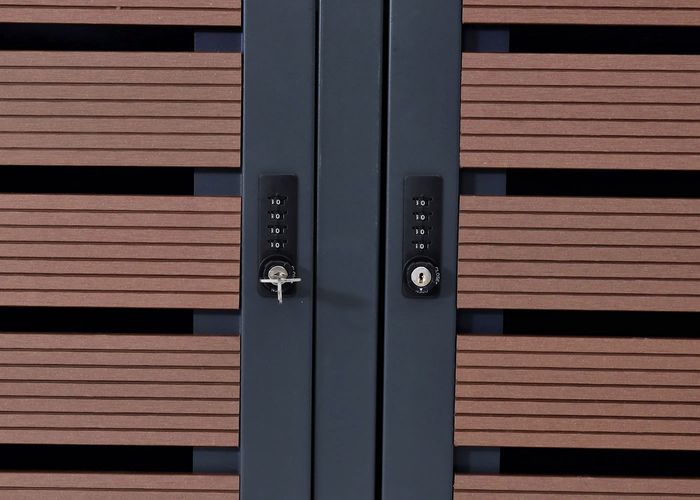 Die Mülltonnenbox ist für handelsübliche Mülltonnen mit einem Fassungsvermögen von 80 bis 240 Litern ausgelegt. Bitte messen Sie im Zweifelsfall Ihre Mülltonne vorher aus. Dieser Mülltonnenschrank ist ideal um gelbe Säcke und Ihre Mülltonne sicher vor Wind aufzubewahren. Die Türen und Deckel sind getrennt abschliessbar: sie verfügen über ein Zahlenschloss, das individuell mit einem 4-stelligen Sicherheitscode eingestellt werden kann.