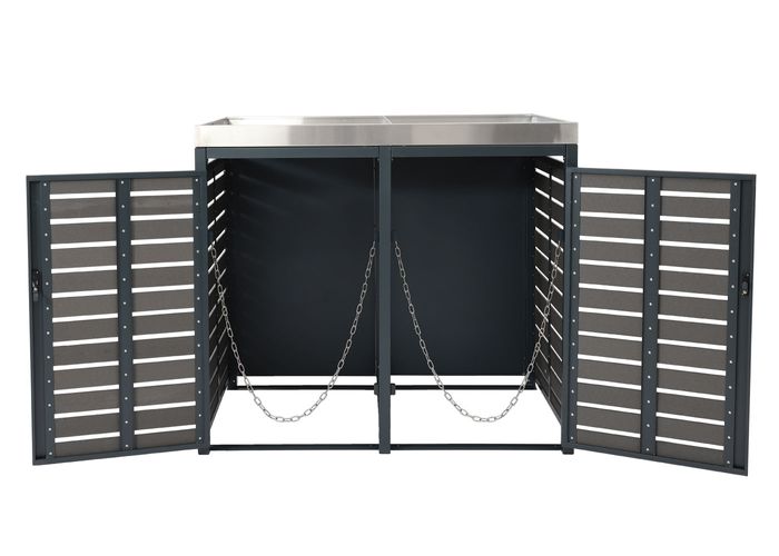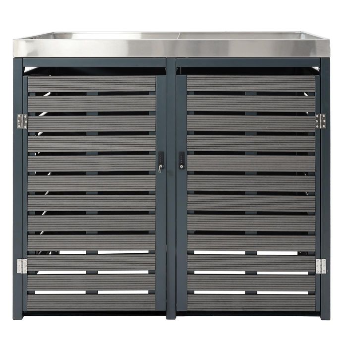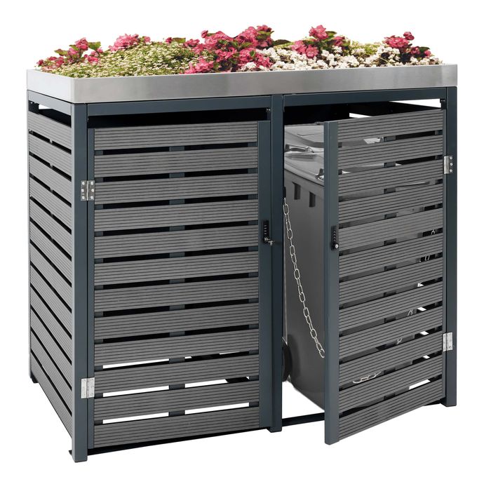 - Diese moderne Mülltonnenverkleidung mit Pflanzkasten ist nicht nur optisch ansprechend. Neben den abschliessbaren Türen und dem stabilen Gehäuse, ist der Pflanzkasten mit Ablauflöchern für überflüssiges Wasser ausgestattet.