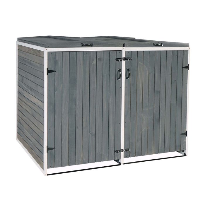Zwischen den einzelnen Abteilen einer 2er-Mülltonnenverkleidung gibt es eine Trennung. Jedes Abteil ist für handelsübliche Mülltonnen mit einem Fassungsvermögen von 80 bis 240 Litern ausgelegt. Der Deckel ist mit einer Halterung ausgestattet, damit bleibt er offen stehen und erleichtert Ihnen das Befüllen der Mülltonnen. Beide Deckel sind ausserdem mit einer Wind-Sicherung durch Ketten ausgestattet. Durch die vier Griffe wird Ihnen das Öffnen und Schliessen der Deckel und Türen erleichtert. Beide Türen verfügen jeweils über zwei Riegelschlösser. Da die Rückwand verkleidet ist, kann der Mülltonnenschrank auch frei aufgestellt werden. Bei Holz handelt es sich um ein Naturprodukt. Wir empfehlen Ihnen dieses in regelmässigen Abständen neu zu behandeln, um es vor Witterungseinflüssen zu schützen.