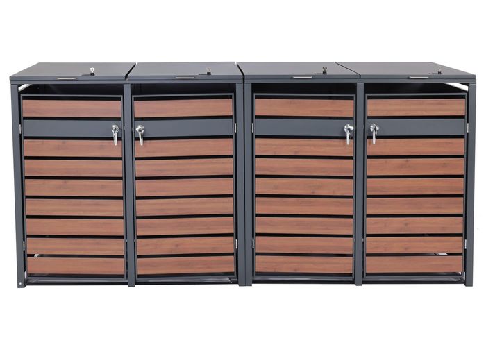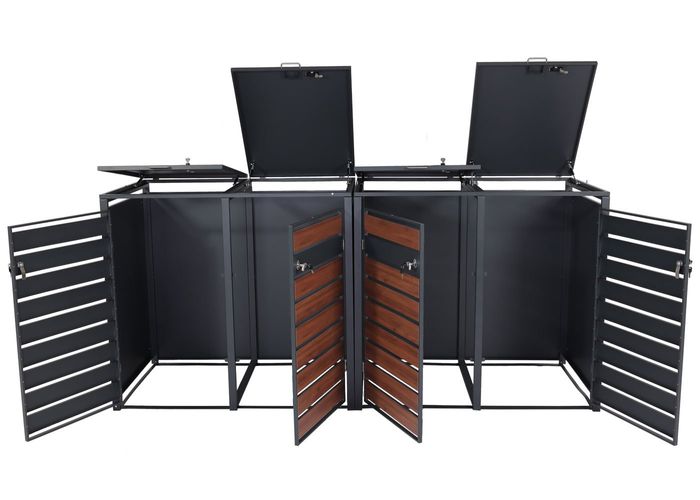 - Diese moderne Mülltonnenverkleidung ist nicht nur optisch ansprechend. Neben den abschliessbaren Türen und einem sehr stabilen Gehäuse, sind die Deckel dieser Mülltonnenverkleidung mit Gasdruckfedern ausgestattet.