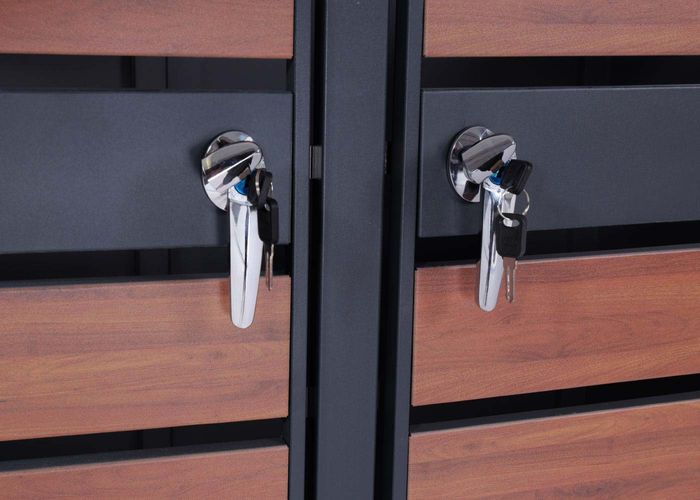 Die Modelle unserer Serie HWC-J81 sind erweiterbar, ganz egal wie viele Mülltonnen Sie unterbringen möchten - Ihnen sind hier keine Grenzen gesetzt. Bitte achten Sie bei der Kombination lediglich auf die passende Gesamttiefe der jeweiligen Modelle. Die Abteile sind für handelsübliche Mülltonnen mit einem Fassungsvermögen von 80 bis 240 Litern ausgelegt. Die Deckel der Mülltonnenverkleidungen können durch passende Schlüssel, als auch durch das Zahlenschloss geöffnet werden, welches individuell mit einem 4-stelligen Sicherheitscode eingestellt werden kann. Sollte das Zahlenschloss verdreht sein, kann dies mithilfe des dazugehörigen Schlüssel geöffnet werden. Bitte beachten Sie, dass der Schlüssel der Türen nicht für das Zahlenschloss am Deckel der Mülltonnenverkleidung vorgesehen ist. An den Deckeln der Mülltonnenbox sind Befestigungen für einen Eisenring vorhanden, wodurch die Deckel der Mülltonnenbox durch ein Nylonseil mit dem Deckel der Abfalltonne verbunden werden kann, so können beide Deckel mit einer Hand geöffnet werden - praktische Einhand-Bedienung. Durch die Belüftungsschlitze wird Kondensatbildung verhindert. Im Lieferumfang ist ein Schlüssel für alle Schlösser enthalten.