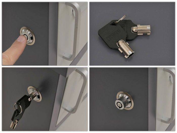 - Zwei seitliche Verriegelungen der Fächer durch Knopfdruck