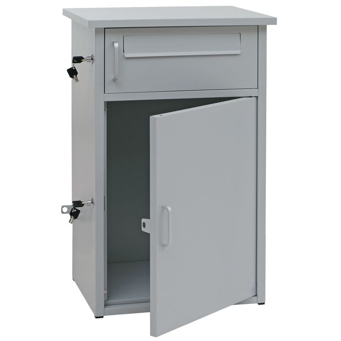 Der Paketkasten O51 vereint funktionale Sicherheit mit modernem Design und ist die perfekte Lösung für den Empfang von Paketen und Briefen - auch bei Abwesenheit. Mit zwei getrennten Fächern für Briefe und Pakete bietet er strukturierte Ordnung und schützt Ihre Sendungen zuverlässig vor Witterung und unbefugtem Zugriff. Beide Fächer lassen sich separat über ein seitliches Knopfdruck-System verriegeln, was die Sicherheit erhöht und ungewollten Zugriff verhindert. Im Lieferumfang sind vier Schlüssel enthalten, mit denen sich die Verriegelung zuverlässig entriegeln lässt - ideal für Familien oder Bürogemeinschaften. Der grosszügige Stauraum ermöglicht die Aufnahme von Paketen mit einer maximalen Grösse von 53x36x31 cm. Damit bietet der O51 auch für grössere Sendungen ausreichend Platz. Die dauerhafte Belastbarkeit beträgt bis zu 5?kg im Briefkastenfach und 10?kg im Paketfach - perfekt für den regelmässigen Versandhandel. Für eine sichere Montage lässt sich der Paketkasten stabil auf ebenem Untergrund wie Zement, Asphalt, Ziegel oder Holzboden fixieren. Bodenanker zur Befestigung sind im Lieferumfang bereits enthalten. Zusätzlich sorgt ein mitgeliefertes Kabel samt Bügelschloss für eine flexible Sicherung an z.?B. einem Regenrohr - so bleibt Ihr Kasten auch im Aussenbereich zuverlässig vor Diebstahl geschützt. Das robuste Stahlgehäuse wiegt ca. 12?kg und bietet Witterungsbeständigkeit sowie langlebige Qualität. Der Paketkasten O51 ist die ideale Lösung für alle, die ihre Sendungen sicher empfangen und gleichzeitig Ordnung, Schutz und eine einfache Handhabung geniessen möchten. Investieren Sie in Ihre Komfortzone - mit dem Paketkasten O51 wird Ihre Haustür zur sicheren Übergabestation.