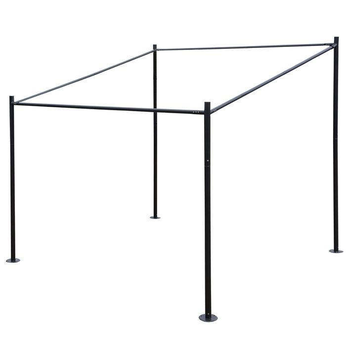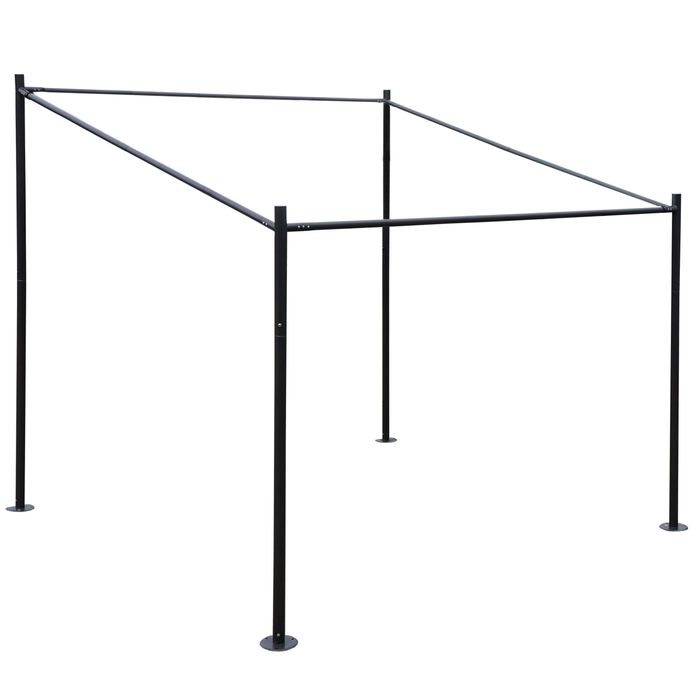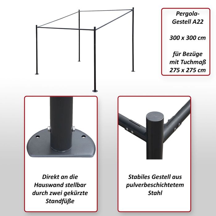 - Das Pergola-Gestell A22 besteht aus pulverbeschichtetem Stahl, ist für Tücher mit 275x275 cm geeignet (Bezug nicht enthalten), hat zwei gekürzte Standfüsse zur direkten Hauswand-Aufstellung und überzeugt durch hohe Stabilität.