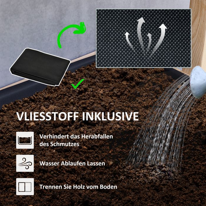 - Verbesserte Wachstumsbedingungen: Mit Entwässerungslöchern und Vliesstoff ausgestattet, fördert dieses Hochbeet die Wurzelatmung, beugt Staunässe vor und mindert Bodenerosion sowie Unkrautwuchs.