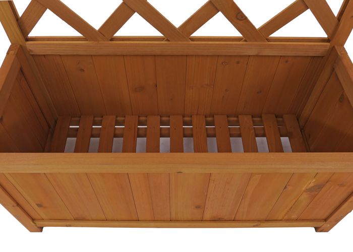 Das integrierte Spalier dient als stabile Rankhilfe für Kletterpflanzen wie Efeu, Clematis oder Duftwicken und verwandelt jede Fläche in eine grüne Oase. Zwei kleine Holzkästen lassen sich flexibel am Gitter anbringen und bieten zusätzlichen Platz für Kräutertöpfe oder liebevoll arrangierte Dekoelemente. Die mittlere Ablagefläche schafft weiteren Stauraum für Blumentöpfe, Gartenzubehör oder saisonale Dekoration und macht den Blumenkasten zu einem echten Allroundtalent.