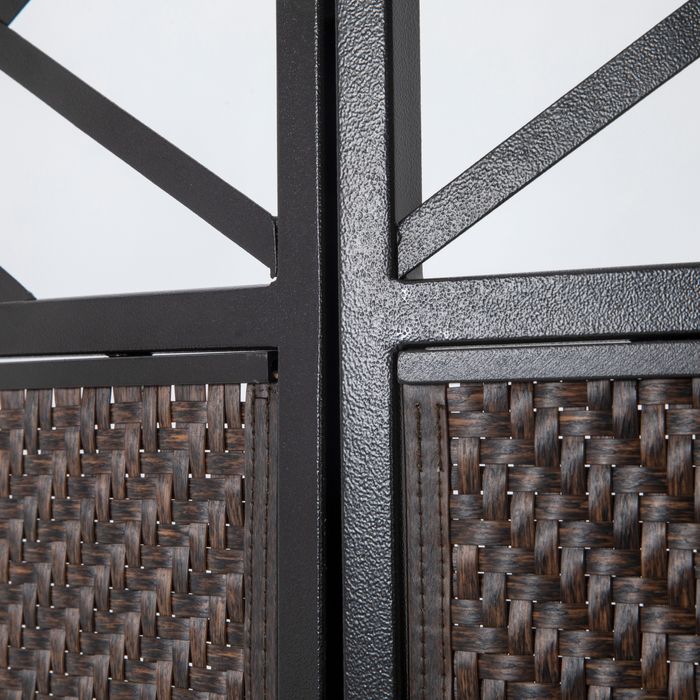 Dieser elegante dreiteilige Raumteiler von Outsunny bietet sofortige Privatsphäre und ist vielseitig einsetzbar. Er lässt sich einfach zusammenklappen und ist dank der glatten Metallscharniere leicht zu bewegen und zu verstauen. Hergestellt aus handgewebtem PE-Rattan und beschichtetem Stahl, verleiht er Aussenbereichen eine natürliche Note. Für den Einsatz auf Rasenflächen sind Erdanker enthalten und die breiten Füsse sorgen für Stabilität. Eine funktionelle und schöne Dekoration für den Garten.