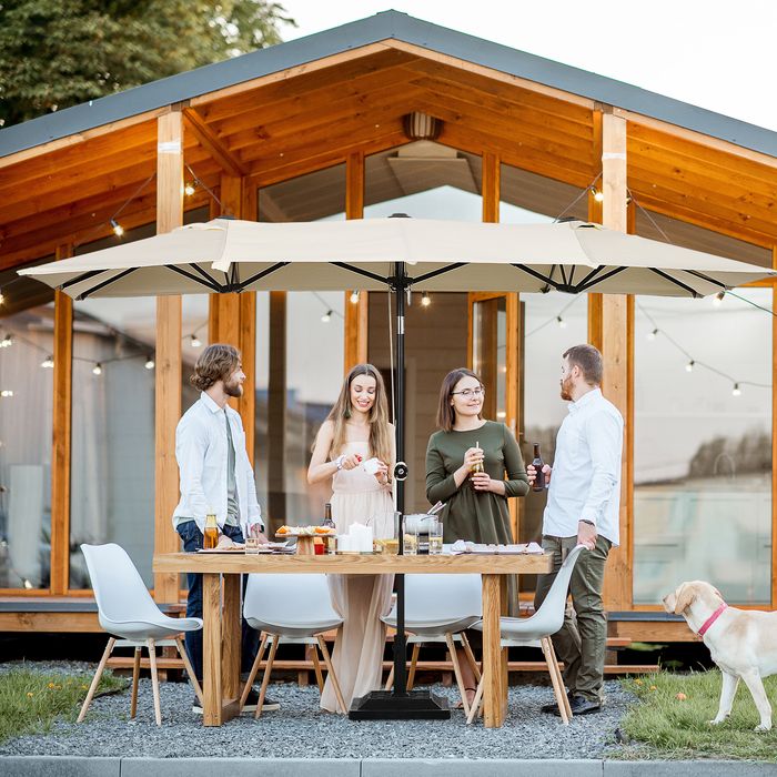 - Doppelseitiger Terrassenschirm: Dieser Gartenschirm sorgt für angenehme Kühle und Schutz vor der Sonne, indem er entweder in einem Loch in einem Terrassentisch oder in einer freistehenden, beschwerten Basis befestigt wird. Geniessen Sie Ihre Zeit im Freien, sei es beim Essen, Plaudern mit Freunden oder beim Spielen eines Brettspiels, ohne sich Gedanken über Sonnenbrand machen zu müssen