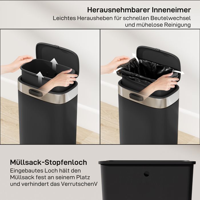 - Ein eingebauter Ring sichert den Müllbeutel und verhindert unordentliche Rutschpartien und Verrutschen