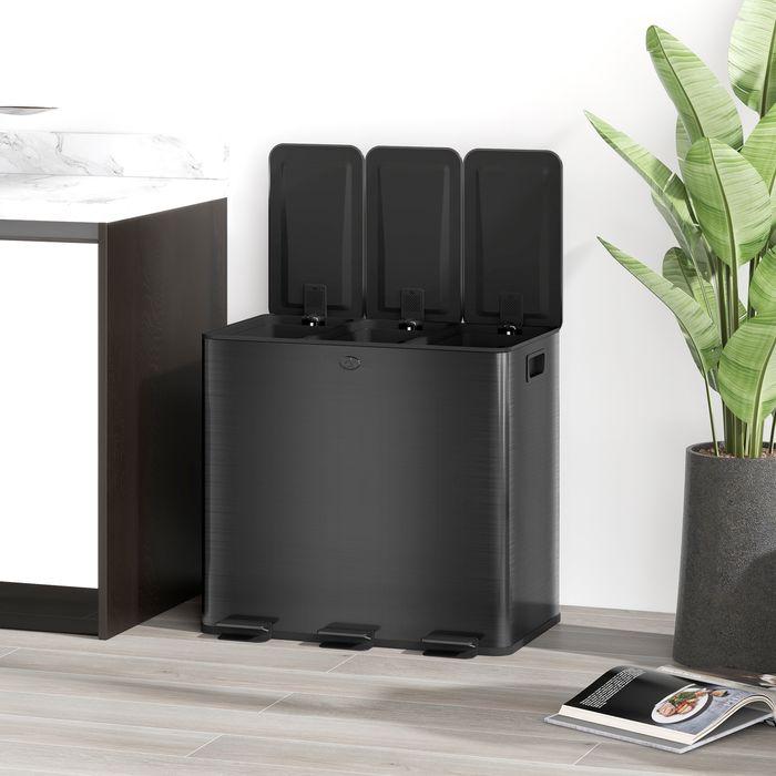 Halten Sie Ihre Küche stilvoll und geruchsfrei mit dem HOMCOM Mülleimer. Dieser dreifache Abfallbehälter bietet drei 15L Fächer und eingebaute Deodorant-Kassetten (Deodorants nicht enthalten), um Gerüche zu bekämpfen. Das elegante, fingerabdrucksichere Edelstahl-Design des Abfalleimers sorgt für einen makellosen Look. Die leisen, sanft schliessenden Deckel mit praktischen Pedalen und herausnehmbaren Treteimern machen die Entsorgung mühelos. Perfekt für jede belebte Küche!