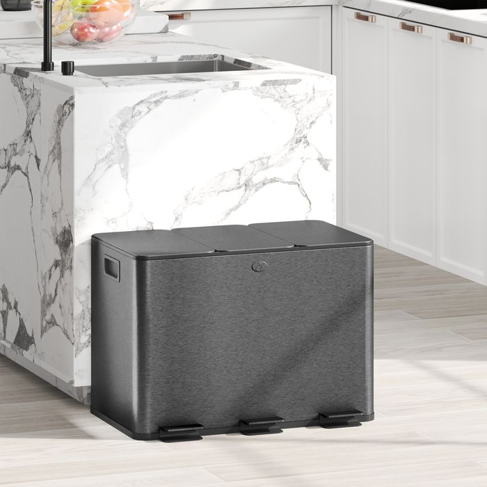 Halten Sie Ihre Küche stilvoll und geruchsfrei mit dem HOMCOM Mülleimer. Dieser dreifache Abfallbehälter bietet drei 20L Fächer und eingebaute Deodorant-Kassetten (Deodorants nicht enthalten), um Gerüche zu bekämpfen. Das elegante, fingerabdrucksichere Edelstahl-Design des Abfalleimers sorgt für einen makellosen Look. Die leisen, sanft schliessenden Deckel mit praktischen Pedalen und herausnehmbaren Treteimern machen die Entsorgung mühelos. Perfekt für jede belebte Küche!