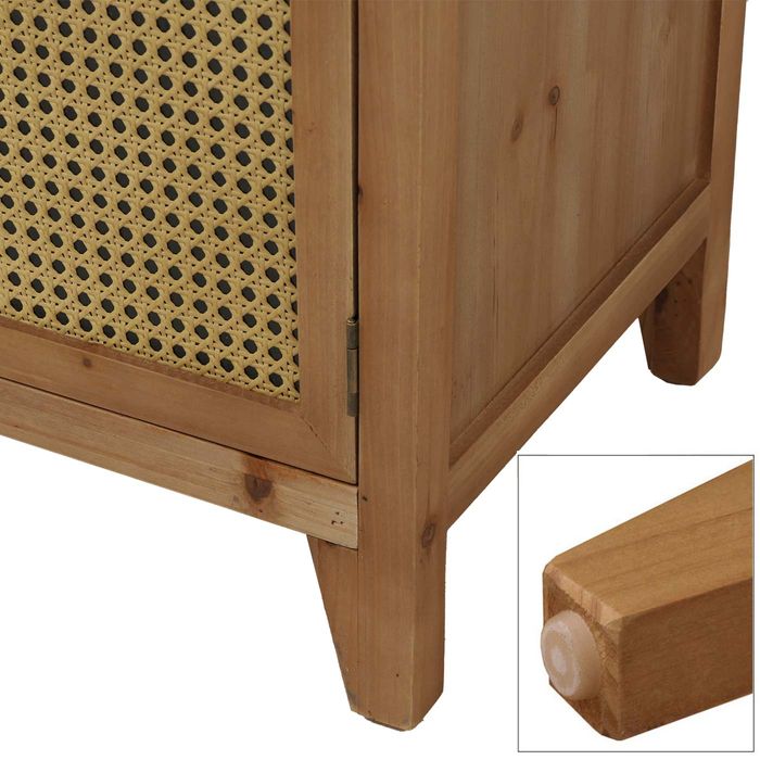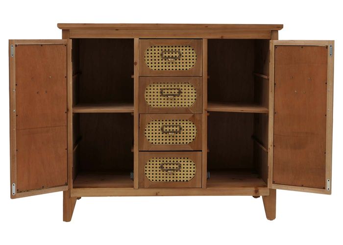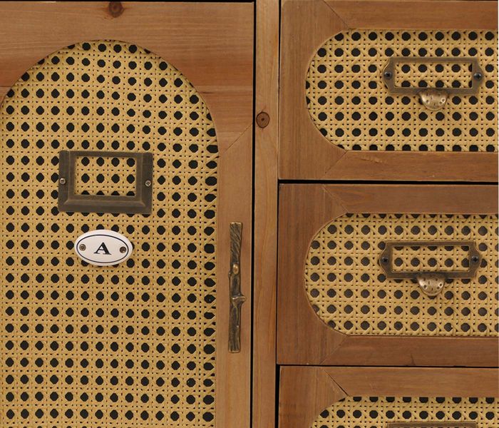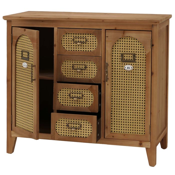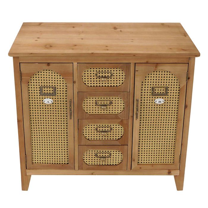 - Vier Schubladen sowie zwei Türen mit vier Fächern bieten Platz zur Aufbewahrung verschiedenster Dinge. Die Fronten in Rattanoptik bringen einen Hauch Natürlichkeit in den Raum, während die Griffe und Fronten den charmanten Retro-Charakter unterstreichen.