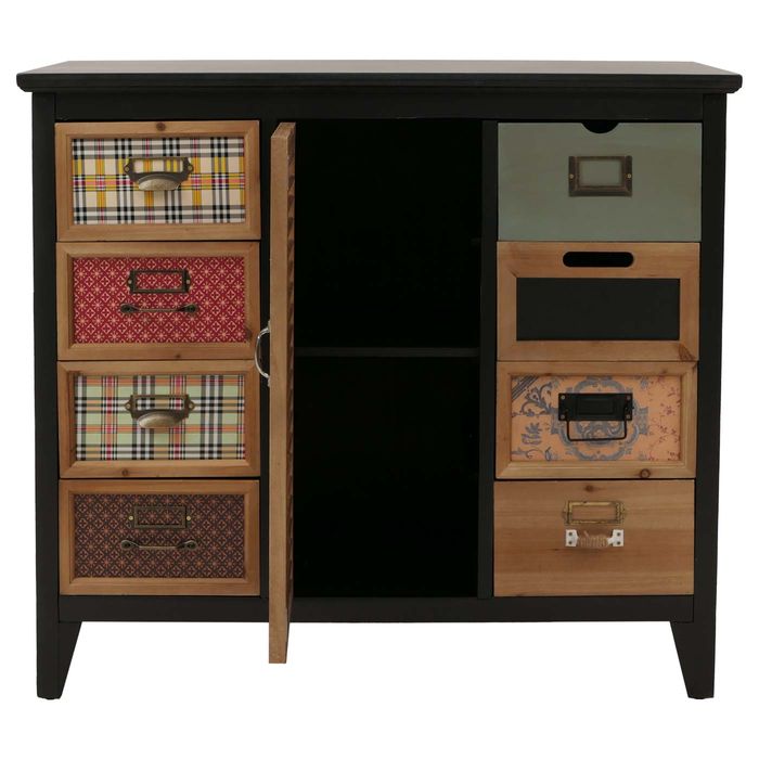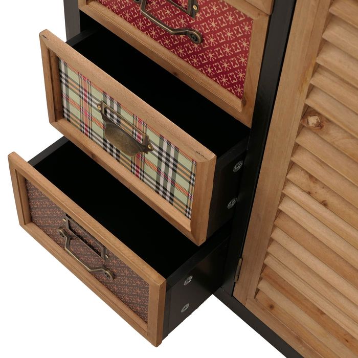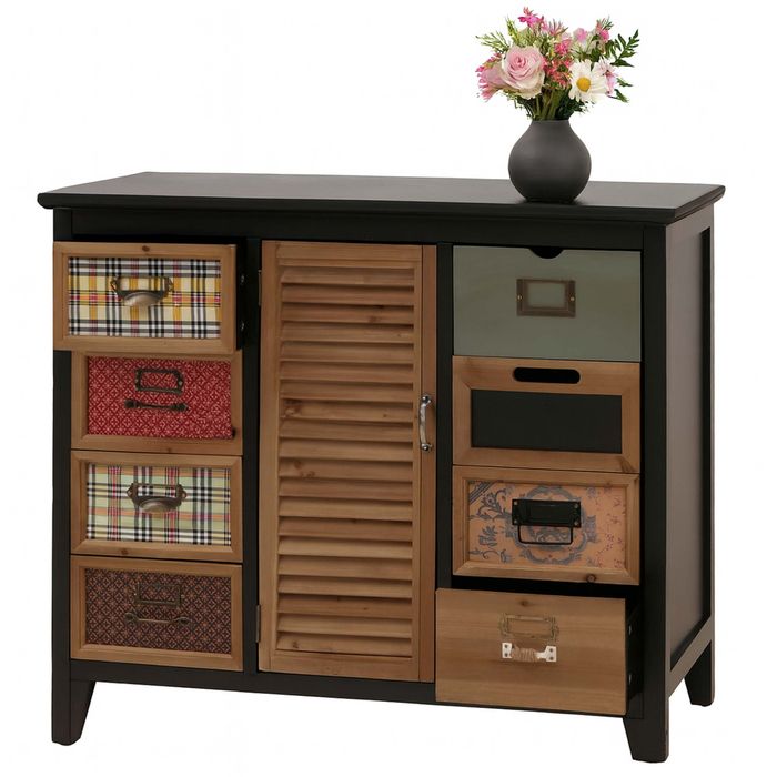 Diese aussergewöhnliche Kommode im charmanten Apothekerschrank-Stil verbindet grosszügigen Stauraum mit einzigartigem Design und wird so zu einem echten Blickfang in jedem Wohnraum. Mit insgesamt acht Schubladen und zwei zusätzlichen Fächern hinter der dekorativen Tür im stilvollen Fensterladen-Design bietet sie reichlich Platz, um Kleidung, Accessoires oder Alltagsgegenstände ordentlich zu verstauen. Die Tür ist mit einem praktischen Magnetverschluss ausgestattet, sodass sie sanft und zuverlässig schliesst. Besonders ins Auge fallen die vielfältig gestalteten Schubladenfronten, die durch den kreativen Mix aus Mustern, Farben und Strukturen einen individuellen Charakter schaffen. Jede Schublade ist ein kleines Design-Highlight für sich und wird durch dekorative Etikettenhalter perfekt ergänzt, die eine individuelle Beschriftung ermöglichen und gleichzeitig den nostalgischen Charme unterstreichen. Unterschiedliche Griffe und Griffmulden machen das Öffnen nicht nur komfortabel, sondern verleihen dem Möbelstück zusätzlichen Vintage-Flair. Das robuste Gestell sorgt für hohe Stabilität, während die Füsse mit praktischen Fussbodenschonern ausgestattet sind, um empfindliche Böden zu schützen. Der gelungene Stil-Mix aus nostalgischem Retro-Design und modernen Elementen macht diese Schubladenkommode zu einem vielseitig einsetzbaren Möbelstück, das sich harmonisch in verschiedene Einrichtungsstile einfügt. Ob im Wohnzimmer, Schlafzimmer, Flur oder Arbeitszimmer - diese Anrichte ist nicht nur funktional, sondern auch ein dekoratives Highlight, das mit seinem besonderen Look sofort alle Blicke auf sich zieht. Wer eine originelle Apothekerkommode, eine charaktervolle Vintage-Kommode oder einen dekorativen Beistellschrank sucht, findet in diesem Möbelstück die perfekte Kombination aus praktischem Stauraum, hochwertiger Verarbeitung und einzigartigem Design.