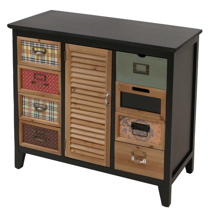 - Die Kommode im Apothekerschrank-Stil bietet mit 8 Schubladen und 2 Fächern hinter einer dekorativen Tür im Fensterladen-Design viel Stauraum. Praktischer Magnetverschluss, stabile Bauweise und Bodenschoner sorgen für Komfort und Langlebigkeit.