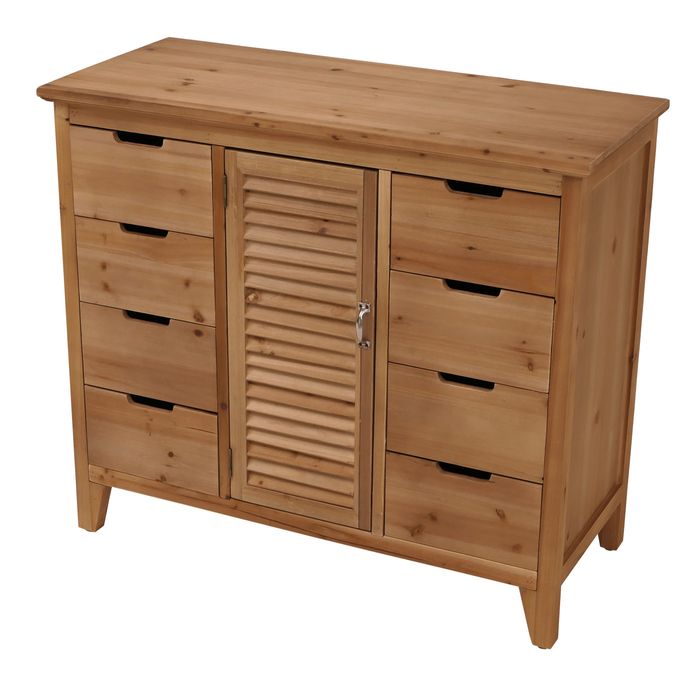 - Diese Kommode bietet viel Stauraum mit 8 Schubladen und 2 Fächern. Eine Tür im Fensterladen-Design mit Magnetverschluss, Schubladen mit Griffmulden sowie ein stabiles Gestell mit bodenschonenden Füssen sorgen für Komfort und Haltbarkeit.