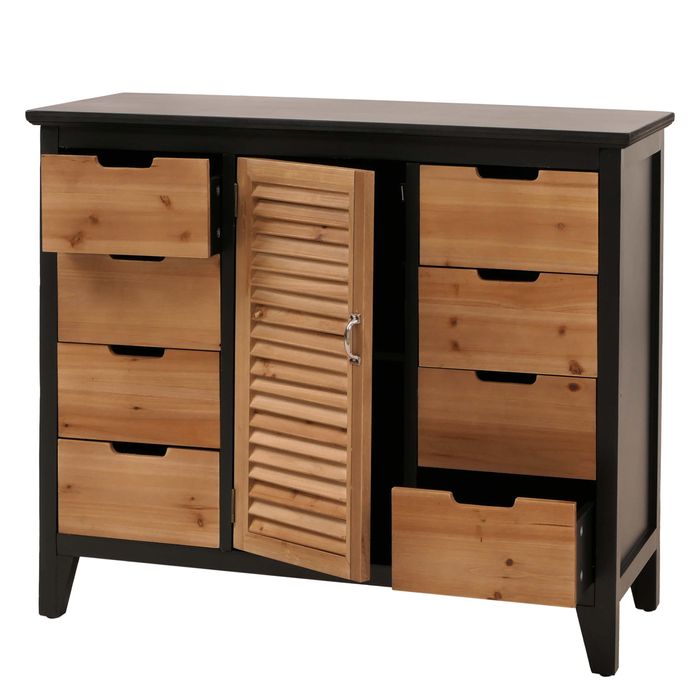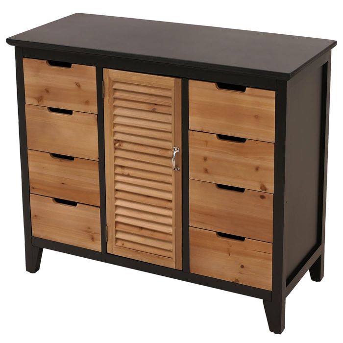 - Diese Kommode bietet viel Stauraum mit 8 Schubladen und 2 Fächern. Eine Tür im Fensterladen-Design mit Magnetverschluss, Schubladen mit Griffmulden sowie ein stabiles Gestell mit bodenschonenden Füssen sorgen für Komfort und Haltbarkeit.