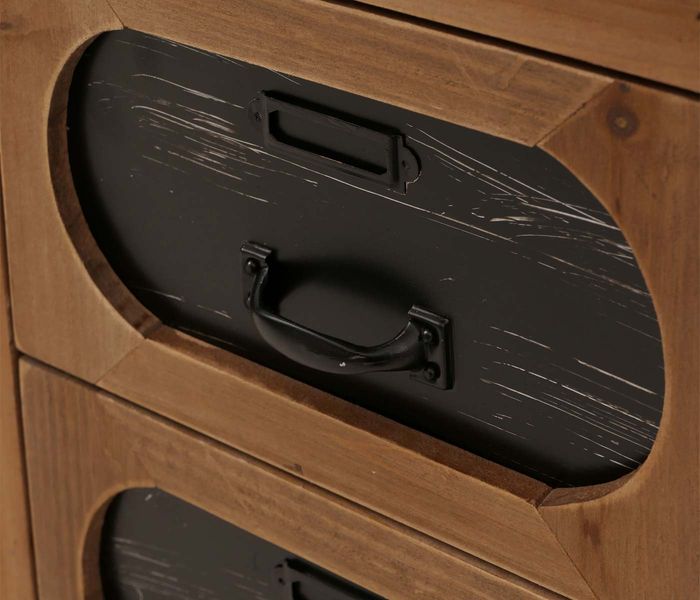 Diese charaktervolle Kommode im nostalgischen Apothekerschrank-Design verbindet praktischen Stauraum mit einem einzigartigen Look im Vintage-Industrial-Stil. Mit acht Schubladen und zwei zusätzlichen Fächern hinter der Tür bietet das Möbelstück reichlich Platz für alles, was im Alltag geordnet und griffbereit sein soll - von Dokumenten über Accessoires bis hin zu Haushaltsutensilien. Die Kombination aus massiver Holzstruktur und schwarzen Metallfronten mit markanten Griffen unterstreicht den charmanten Werkstatt-Charakter und macht die Kommode zu einem echten Blickfang in jedem Wohnraum. Ein besonderes Detail ist die Tür mit dekorativem Lüftungsgitter und rustikalem Metallgriff, die dem Möbel einen authentischen Fabrik-Look verleiht. Dank des integrierten Magnetverschlusses lässt sich die Tür mühelos schliessen und bleibt dennoch zuverlässig sicher verschlossen. Die Schubladen sind mit praktischen Etikettenhaltern versehen, sodass eine individuelle Beschriftung möglich ist und die Ordnung stets gewahrt bleibt. Für einen sicheren Stand sorgen stabile Füsse, die mit Fussbodenschonern ausgestattet sind und empfindliche Untergründe zuverlässig schützen. Das robuste Gestell verleiht der Schubladenkommode hohe Stabilität und sorgt dafür, dass Sie lange Freude an diesem Möbelstück haben werden. Ob als Sideboard im Wohnzimmer, als originelle Kommode im Flur oder als Stauraummöbel im Arbeitszimmer - diese Arzneikommode mit ihrem stilvollen Retro-Charme und modernen Industrial-Touch fügt sich harmonisch in verschiedene Einrichtungsstile ein und setzt zugleich markante Akzente. Wer Wert auf Design, Funktionalität und Langlebigkeit legt, findet in diesem Möbelstück die perfekte Kombination aus ästhetischem Statement und praktischem Nutzen.