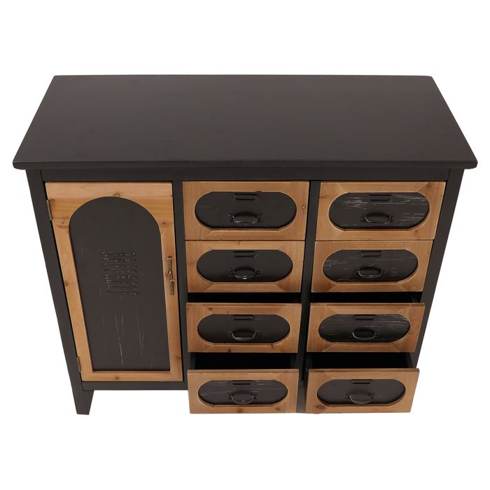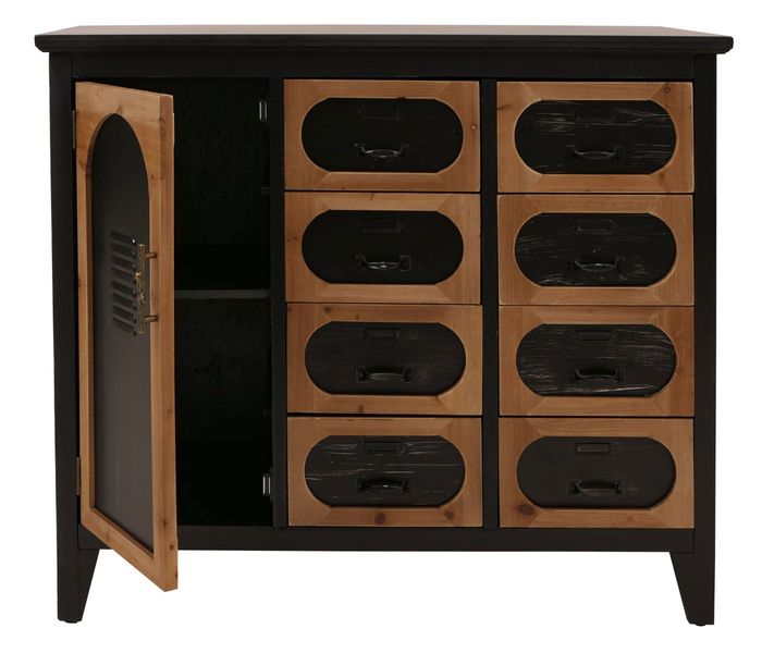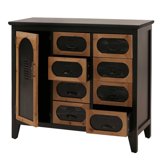 Diese charaktervolle Kommode im nostalgischen Apothekerschrank-Design verbindet praktischen Stauraum mit einem einzigartigen Look im Vintage-Industrial-Stil. Mit acht Schubladen und zwei zusätzlichen Fächern hinter der Tür bietet das Möbelstück reichlich Platz für alles, was im Alltag geordnet und griffbereit sein soll - von Dokumenten über Accessoires bis hin zu Haushaltsutensilien. Die Kombination aus massiver Holzstruktur und schwarzen Metallfronten mit markanten Griffen unterstreicht den charmanten Werkstatt-Charakter und macht die Kommode zu einem echten Blickfang in jedem Wohnraum. Ein besonderes Detail ist die Tür mit dekorativem Lüftungsgitter und rustikalem Metallgriff, die dem Möbel einen authentischen Fabrik-Look verleiht. Dank des integrierten Magnetverschlusses lässt sich die Tür mühelos schliessen und bleibt dennoch zuverlässig sicher verschlossen. Die Schubladen sind mit praktischen Etikettenhaltern versehen, sodass eine individuelle Beschriftung möglich ist und die Ordnung stets gewahrt bleibt. Für einen sicheren Stand sorgen stabile Füsse, die mit Fussbodenschonern ausgestattet sind und empfindliche Untergründe zuverlässig schützen. Das robuste Gestell verleiht der Schubladenkommode hohe Stabilität und sorgt dafür, dass Sie lange Freude an diesem Möbelstück haben werden. Ob als Sideboard im Wohnzimmer, als originelle Kommode im Flur oder als Stauraummöbel im Arbeitszimmer - diese Arzneikommode mit ihrem stilvollen Retro-Charme und modernen Industrial-Touch fügt sich harmonisch in verschiedene Einrichtungsstile ein und setzt zugleich markante Akzente. Wer Wert auf Design, Funktionalität und Langlebigkeit legt, findet in diesem Möbelstück die perfekte Kombination aus ästhetischem Statement und praktischem Nutzen.
