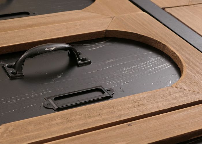 - Tür mit dekorativem Lüftungsgitter und rustikalem Metallgriff