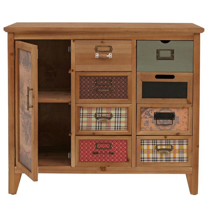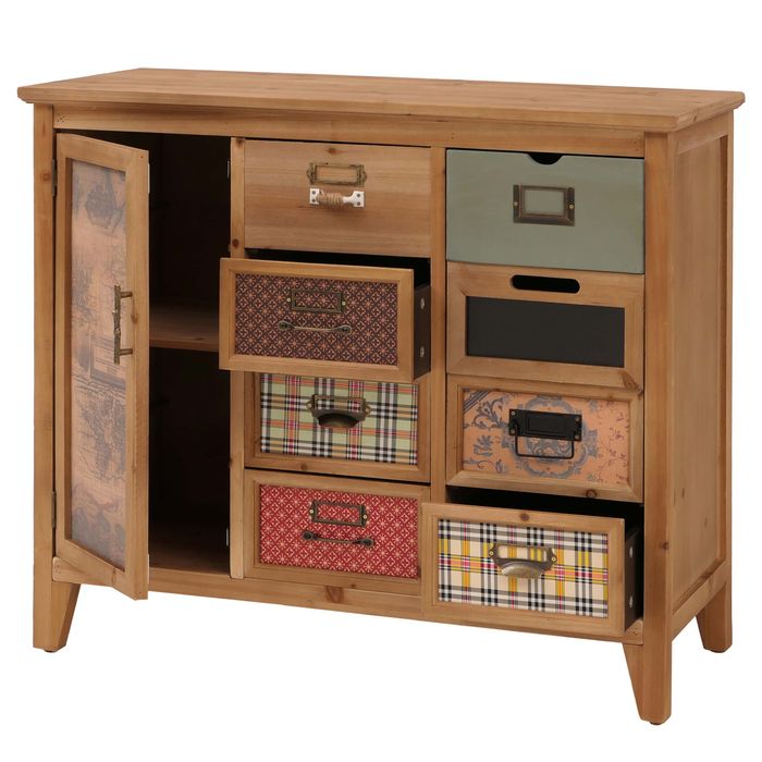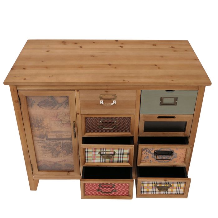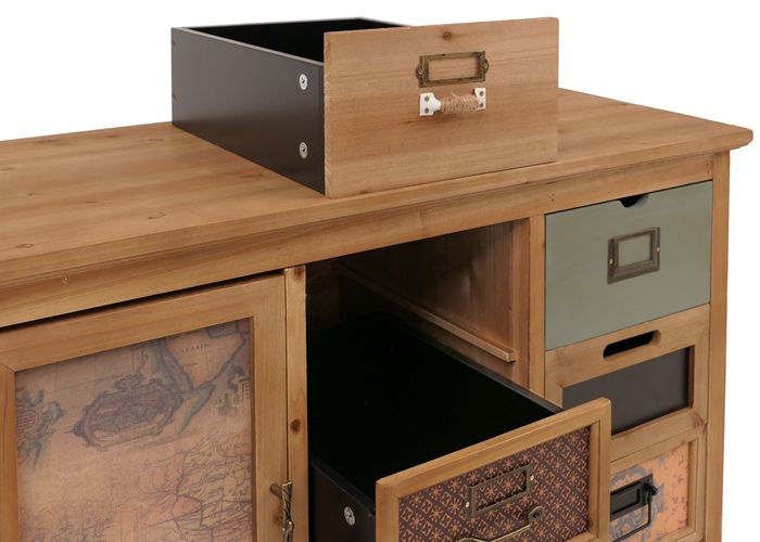 - Diese Vintage-Kommode mit 8 Schubladen und 2 Fächern bietet viel Stauraum und überzeugt mit einer dekorativen Tür im Weltkarten-Design samt Magnetverschluss. Unterschiedliche Fronten, Griffe und Etikettenhalter machen sie zum stilvollen Hingucker.
