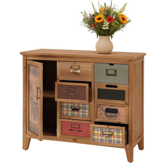 - Das robuste Gestell sorgt für Stabilität, während Fussbodenschoner die Böden schützen. Im Mix aus Mustern und Farben setzt die Kommode im Apothekerstil dekorative Akzente und kombiniert nostalgisches Flair mit modernem Wohnkomfort.