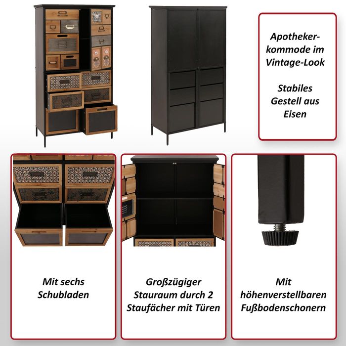 - Dank den sechs Schubladen und zwei Staufächern wird Ordnung wortwörtlich zum Kinderspiel, ganz egal ob Sie die Kommode im Eingangsbereich, im Wohnzimmer oder im Gästezimmer platzieren - diese Apothekerkommode wird zum Blickfang in Ihren vier Wänden.
