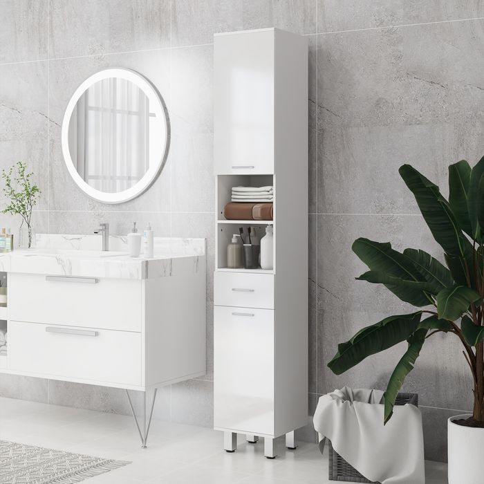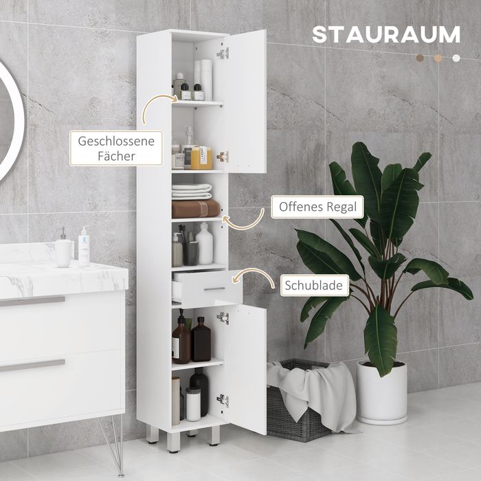Brauchen Sie zusätzlichen Stauraum im Bad? Sicher doch. Der schlanke Badezimmerschrank von schafft genau den benötigten Platz. Er passt perfekt in jene engen Ecken, die sonst ungenutzt bleiben. Ideal, um Hygieneartikel, Reinigungsmittel oder Handtücher griffbereit zu verstauen. Vermeiden Sie Überfüllung im Flurschrank und halten Sie Notwendiges mit diesem Bodenschrank direkt im Bad verfügbar.
