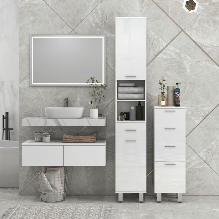 - Fein verarbeitet: Der Badschrank ist mit einer Kippsicherung ausgestattet, die für zusätzliche Sicherheit an der Wand befestigt werden kann. Aus robustem Spanplattenmaterial gefertigt, ist er besonders langlebig; zudem sind die melaminbeschichtete Oberfläche und die Hochglanztüren leicht zu reinigen und wasserabweisend.