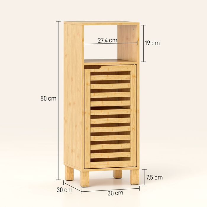 Plagen Sie Unordnung im engen Badezimmer? Der morgendliche Ansturm wird chaotisch, wenn alles verteilt liegt und kein Ablageplatz vorhanden ist. Der schlanke Badezimmerschrank, 30 x 30 cm gross, passt perfekt in kleine Ecken und bringt Ordnung in Ihre Utensilien. Aus natürlichem Bambus hergestellt, verleiht der Beistellschrank Ihrem Bad eine warme, elegante Ausstrahlung für einen entspannten, aufgeräumten Tagesbeginn.