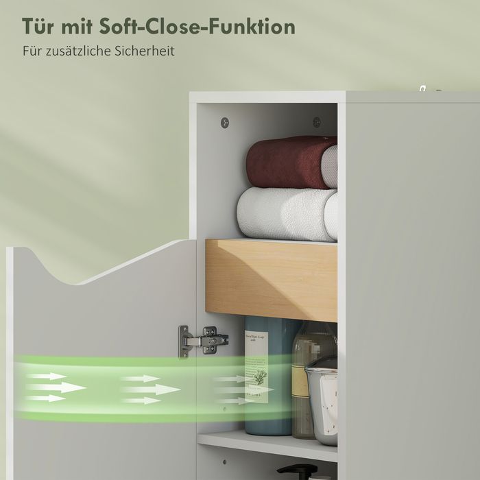 Bringen Sie Stil und Funktionalität in Ihr Badezimmer mit dem Badezimmerschrank. Das offene Regal oben bietet schnellen Zugriff auf wichtige Utensilien, während der untere Schrank mit verstellbarem Regal Ihre Toilettenartikel, Reinigungsmittel oder persönlichen Dinge diskret verstaut. Mit weisser und natürlicher Holzoptik sowie Soft-Close-Tür des Badschranks fügt er sich harmonisch in moderne Designs ein. Sorgen Sie für ein aufgeräumtes Badezimmer ohne Mühe!