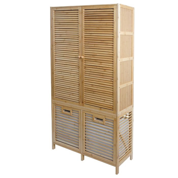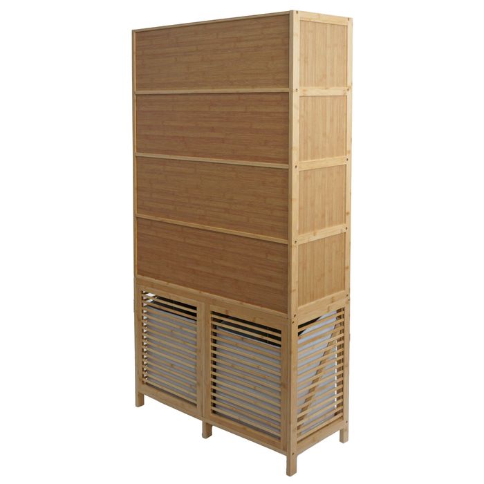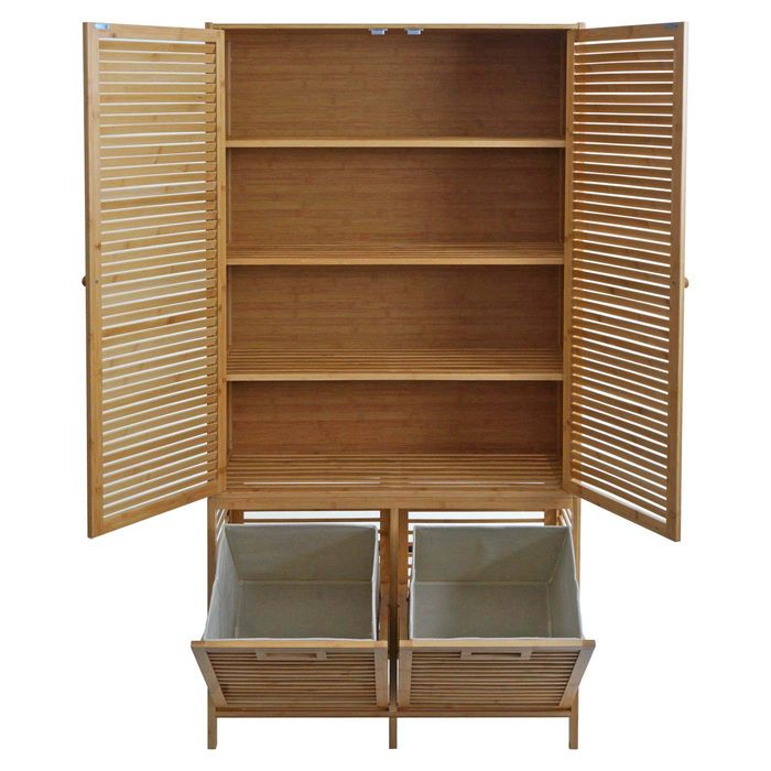 - Der Badezimmerschrank N83 aus hochwertigem Bambus bietet mit zwei Wäschekörben und Schrankfächern grosszügigen Stauraum und eine stilvolle Lösung für Ihr Badezimmer. Die herausnehmbaren Stoffeinsätze sorgen für Flexibilität.