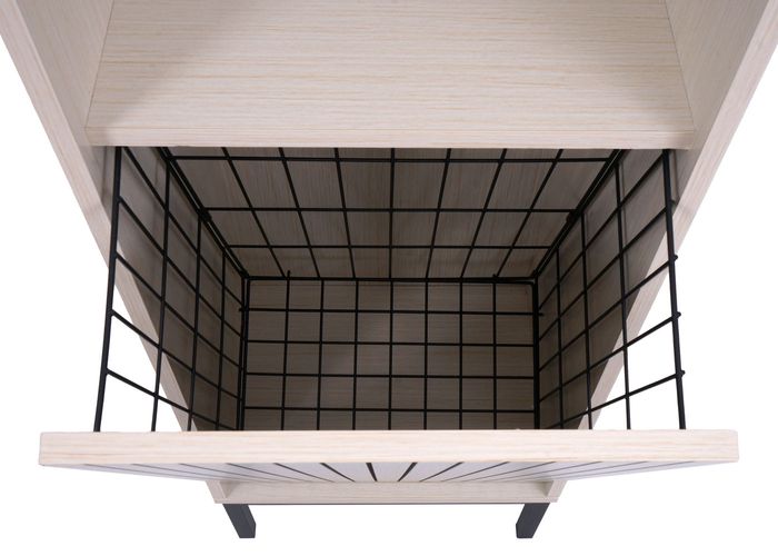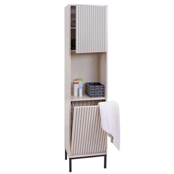 - Mit zwei geschlossenen Fächern, einem offenen Fach und einem Kippfach mit Wäschekorb schafft er grosszügigen Stauraum. Wandbefestigung, Fussbodenschoner und stabile Böden mit bis zu 10 kg Belastbarkeit sorgen für Sicherheit und Langlebigkeit.