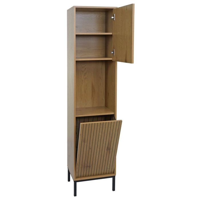 Der Hochschrank der Serie O42 vereint modernes Design mit maximaler Funktionalität und ist die perfekte Wahl für ein stilvolles und zugleich praktisches Badezimmer. Mit seiner strukturierten Oberfläche in minimalistischer Optik wird er zum eleganten Blickfang, der sich mühelos mit weiteren Möbelstücken der Serie O42 kombinieren lässt und so ein harmonisches Gesamtbild schafft. Die Oberfläche ist mit einer hochwertigen Melamin-Beschichtung versehen, die besonders kratzfest und wasserabweisend ist - ideal für den täglichen Einsatz im Bad, wo Feuchtigkeit und Beanspruchung unvermeidbar sind. In zwei Fächern hinter einer geschlossenen Tür sowie in einem offenen Fach bietet der Hochschrank grosszügigen Stauraum für Handtücher, Pflegeprodukte und Badutensilien. Ein integriertes Kippfach mit praktischem Wäschekorb sorgt zusätzlich für Ordnung und erleichtert die tägliche Organisation. Die Tür schliesst sanft und leise dank Soft-Close-Funktion, was nicht nur den Bedienkomfort erhöht, sondern auch die Lebensdauer des Schranks verlängert. Jeder Regalboden ist bis zu 10 kg belastbar und bietet somit ausreichend Stabilität auch für schwerere Gegenstände. Für zusätzliche Sicherheit ist eine Vorrichtung zur Wandbefestigung vorhanden. Dank der Fussbodenschoner werden empfindliche Böden optimal geschützt, während die filigranen schwarzen Füsse dem Möbelstück einen modernen, leichten Charakter verleihen. Mit diesem Hochschrank entscheiden Sie sich nicht nur für ein ästhetisches Design-Highlight, sondern auch für eine langlebige und durchdachte Aufbewahrungslösung, die Ihr Badezimmer.