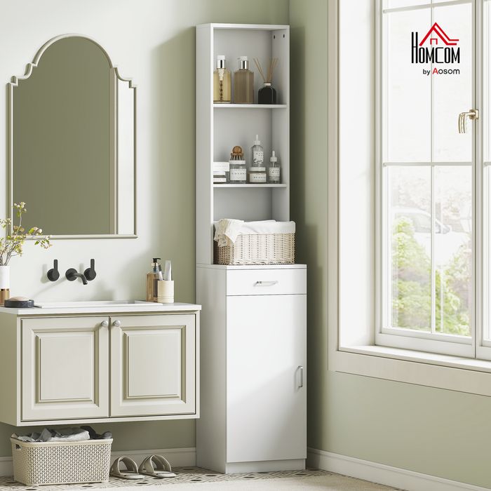 - Maximierte Lageroptionen: Dieser kompakte Badezimmer Hochschrank bietet mit einem geschlossenen Schrank, einer Schublade und drei offenen Fächern reichlich Platz für Handtücher, Pflegeprodukte und Accessoires, um Ihr Bad ordentlich zu halten