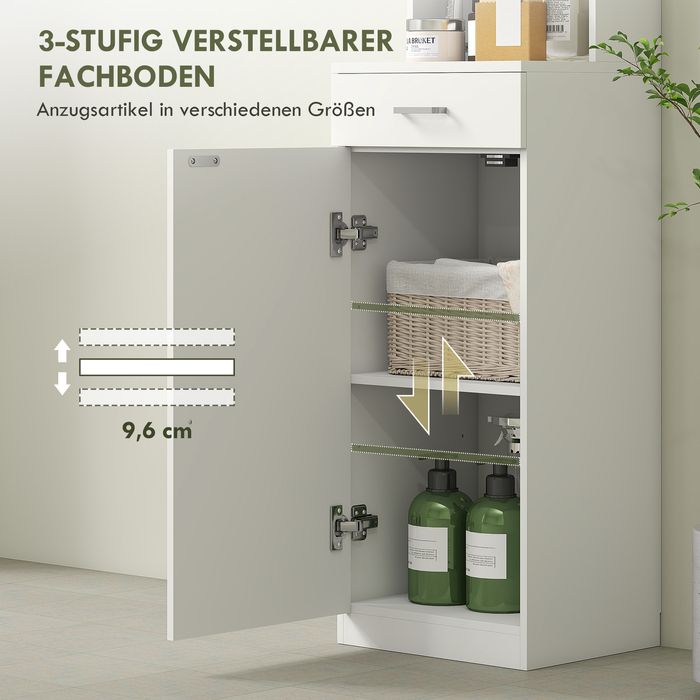 Verabschieden Sie sich stilvoll vom Chaos im Badezimmer. Der HOMCOM Badezimmerschrank ist clever konzipiert, passt perfekt in enge Räume und bietet gleichzeitig maximalen Stauraum. Mit einem geschlossenen Schrank mit verstellbarem Einlegeboden, einer Schublade und drei offenen Fächern sorgt dieses schlanke Badmöbel für Ordnung und griffbereite Ordnung. Dank integrierter Kippschutzfunktion vereint der Badschrank Funktionalität und Eleganz in Ihrem Badezimmer, ebenso Küche, oder Waschküche.