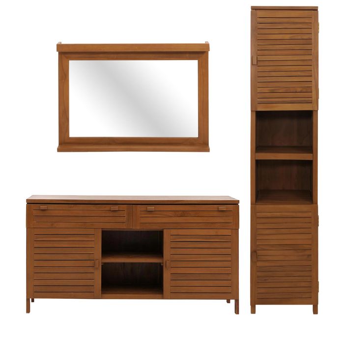 Das Teak-Badezimmerset verbindet zeitloses Design mit hochwertiger Verarbeitung und bringt natürlichen Charme in Ihr Badezimmer. Hergestellt aus B-Grade-Teakholz, das aus dem Kernholz der Tectona Grandis stammt und 20-30 Jahre gereift ist, besticht dieses Badezimmerset durch die Langlebigkeit und Widerstandsfähigkeit. Dank der natürlichen Öle des Teakholzes sind die Produkte perfekt für Nassräume geeignet und trotzt Feuchtigkeit mühelos. Mit zwei kleinen Ablagefächern bietet der Spiegel ausreichend Platz für Ihre Badutensilien. Die rückseitige Aufhängevorrichtung sorgt zudem für eine unkomplizierte Montage. Durchdachte Funktionalität trifft auf grosszügigen Stauraum bei dem Waschtisch: Zwei offene Staufächer bieten schnellen Zugriff auf Ihre täglichen Utensilien, während zwei geschlossene Fächer mit Türen sowie zwei Schubladen für geordnete Verhältnisse sorgen. Mit zwei offenen Fächern bietet der Hochschrank eine perfekte Bühne für Ihre schönsten Accessoires, während die vier zusätzlichen Staufächer mit zwei Türen für Ordnung und Stauraum sorgen. Ob Handtücher, Pflegeprodukte oder Deko-Objekte – alles findet seinen Platz und bleibt dabei stets gut geschützt. Die integrierten Fussbodenschoner verhindern unschöne Kratzer auf empfindlichen Böden und gewährleisten einen stabilen Stand auf jeder Oberfläche.