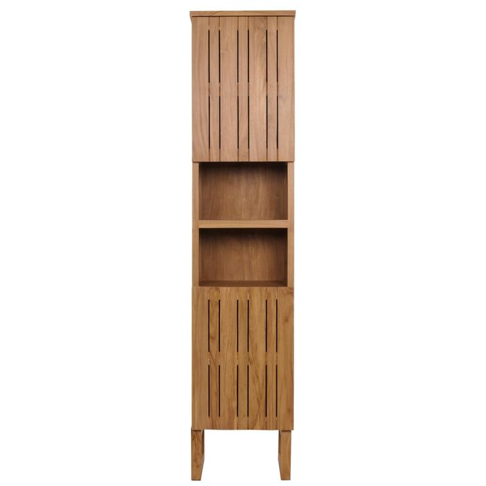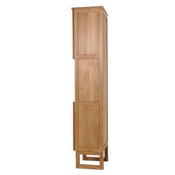 Entdecken Sie den idealen Aufbewahrungsort für Ihr Badezimmer – unseren Teakholz-Hochschrank in elegantem Design, der Funktionalität und Stil meisterhaft vereint. Dieses unverzichtbare Möbelstück wird ohne Dekoration geliefert, sodass Sie sofort mit der persönlichen Gestaltung beginnen können. Vier Staufächer sind mit einer Tür und einem praktischen Einlegeboden ausgestattet, was Ihnen ermöglicht, Handtücher, Pflegeprodukte und weitere Badezimmerutensilien ordentlich und griffbereit zu verstauen. Er ist nicht nur ein Blickfang für sich, sondern auch ideal kombinierbar mit weiteren Produkten unserer Teakholz-Serie.