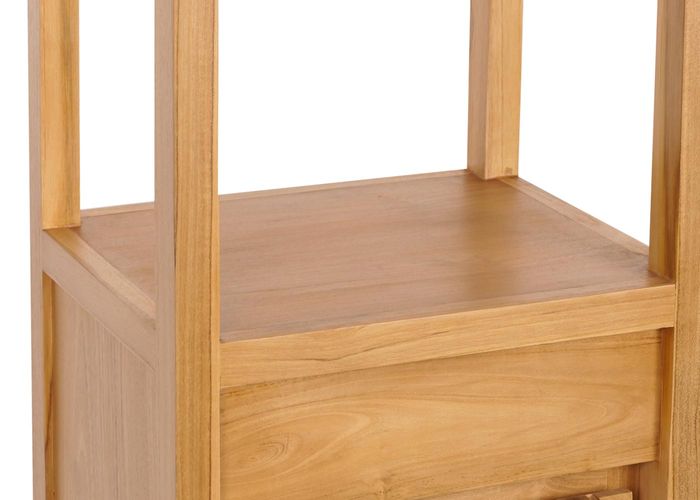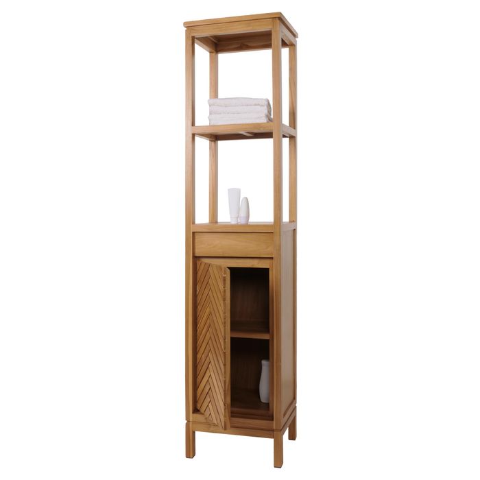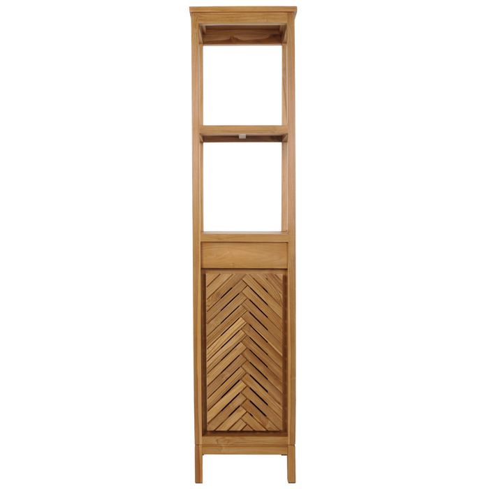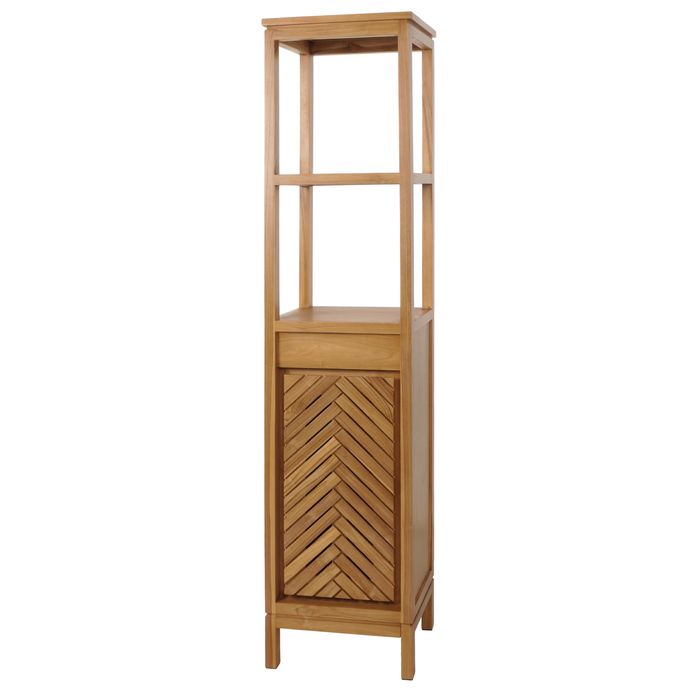 Entdecken Sie den idealen Aufbewahrungsort für Ihr Badezimmer – unseren Teakholz-Hochschrank in elegantem Design, der Funktionalität und Stil meisterhaft vereint. Dieses unverzichtbare Möbelstück wird ohne Dekoration geliefert, sodass Sie sofort mit der persönlichen Gestaltung beginnen können. Zwei grosszügigen Staufächer sind mit einer Tür und einem praktischen Einlegeboden ausgestattet, was Ihnen ermöglicht, Handtücher, Pflegeprodukte und weitere Badezimmerutensilien ordentlich und griffbereit zu verstauen.