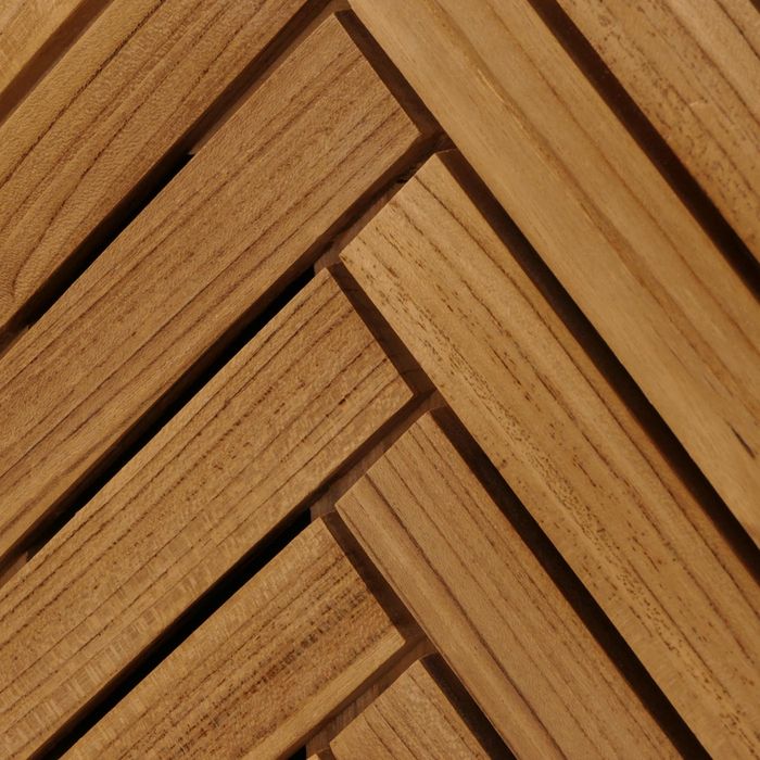 Die Tür bezaubert mit einem einzigartigen Fischgrätenmuster. Er ist nicht nur ein Blickfang für sich, sondern auch ideal kombinierbar mit weiteren Produkten unserer Teakholz-Serie.