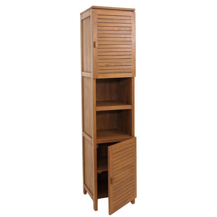 - Unser Teakholz-Hochregal vereint natürliche Schönheit mit erstklassiger Qualität des Teakholzes in hochwertigem Grade B. Die ideale Lösung für alle, die ihr Badezimmer ordentlich halten und gleichzeitig eine wohnliche Atmosphäre schaffen möchten.
