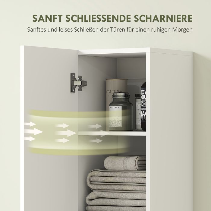- Soft-Close-Scharniere: Jede Tür des schmalen Badezimmerschranks ist mit Soft-Close-Scharnieren aus Edelstahl ausgestattet, die ein leises und sanftes Schliessen ermöglichen und so zu einer beruhigenden Atmosphäre in Ihrem Alltag beitragen.