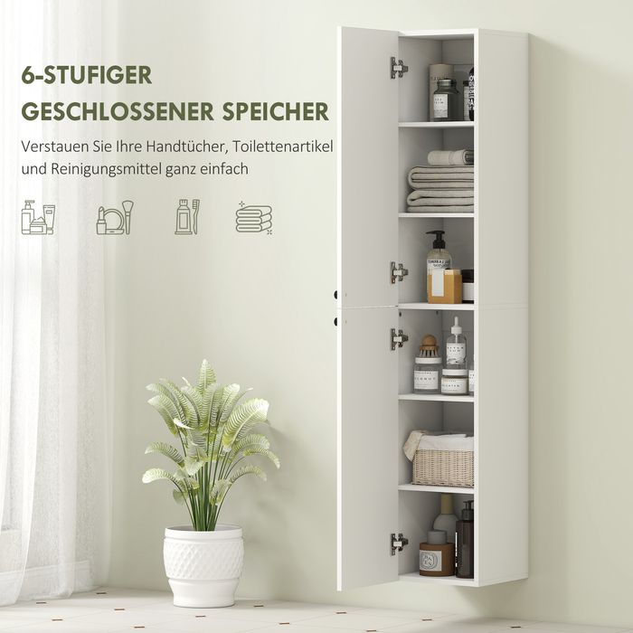 Verwandeln Sie Ihr vollgestelltes Bad in eine entspannende Oase mit dem schlanken HOMCOM Hochschrank. Platzprobleme? Die wandmontierte Bauweise nutzt den vertikalen Raum optimal und befreit den Boden. Dank Soft-Close-Scharniere bleibt Ihr Raum ruhig, und in den zwei Schränken mit je drei Fächern verstauen Sie bequem alle Essentials. Perfekt für Bad oder Küche, verbindet dieses elegante Speichermodul zeitgemässes Design mit Funktionalität und bereichert so Ihren Alltag.